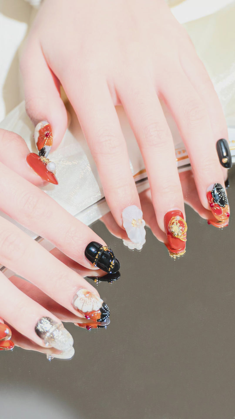 Handmade Short Round Press-On Nails - Red Black Gold Flower 3D Hand-Painted 10 Pcs #216