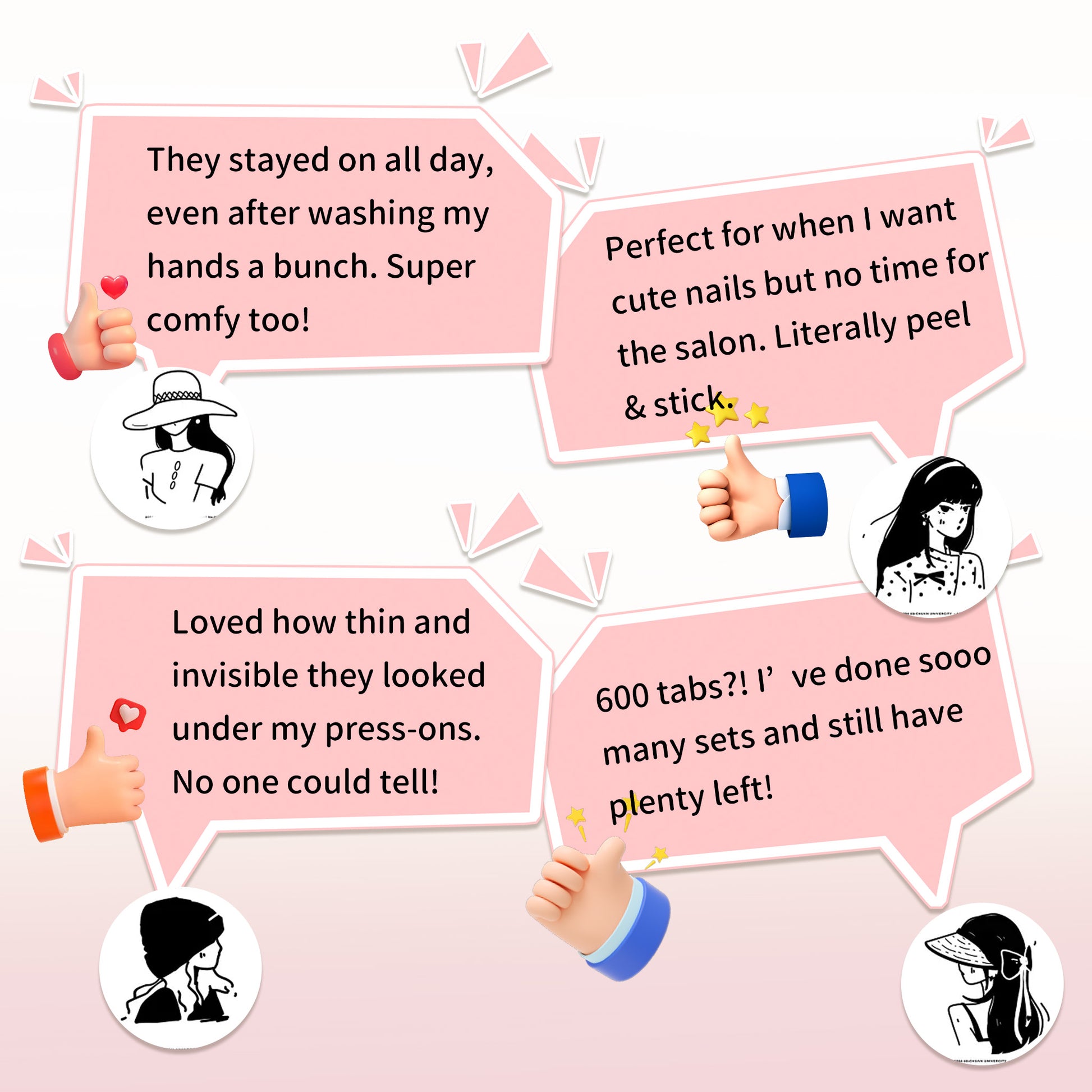 Each set includes 600 tabs in 12 sizes to fit both hands. Made with skin-friendly, remover-free materials, they're gentle on your nails and kind to the planet.