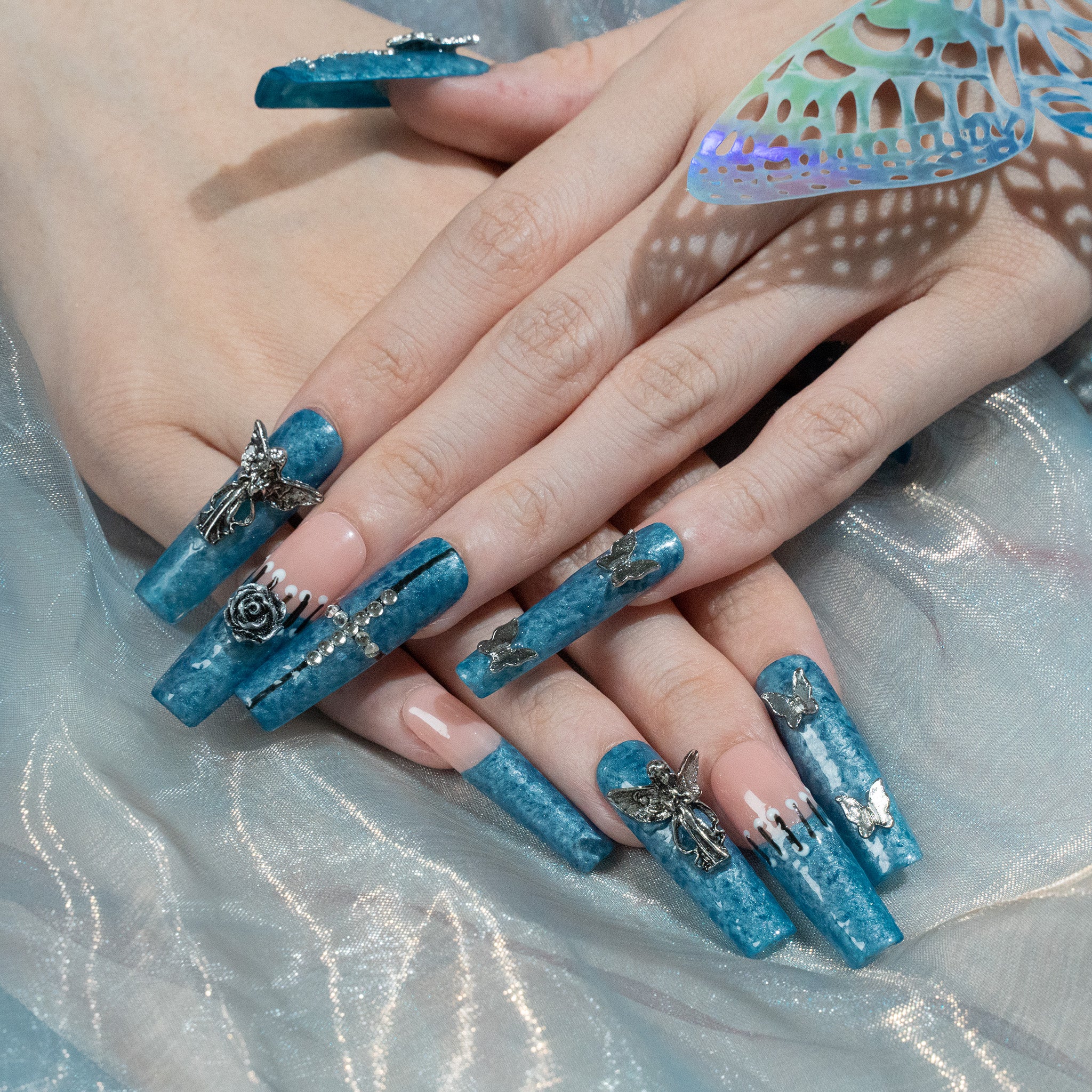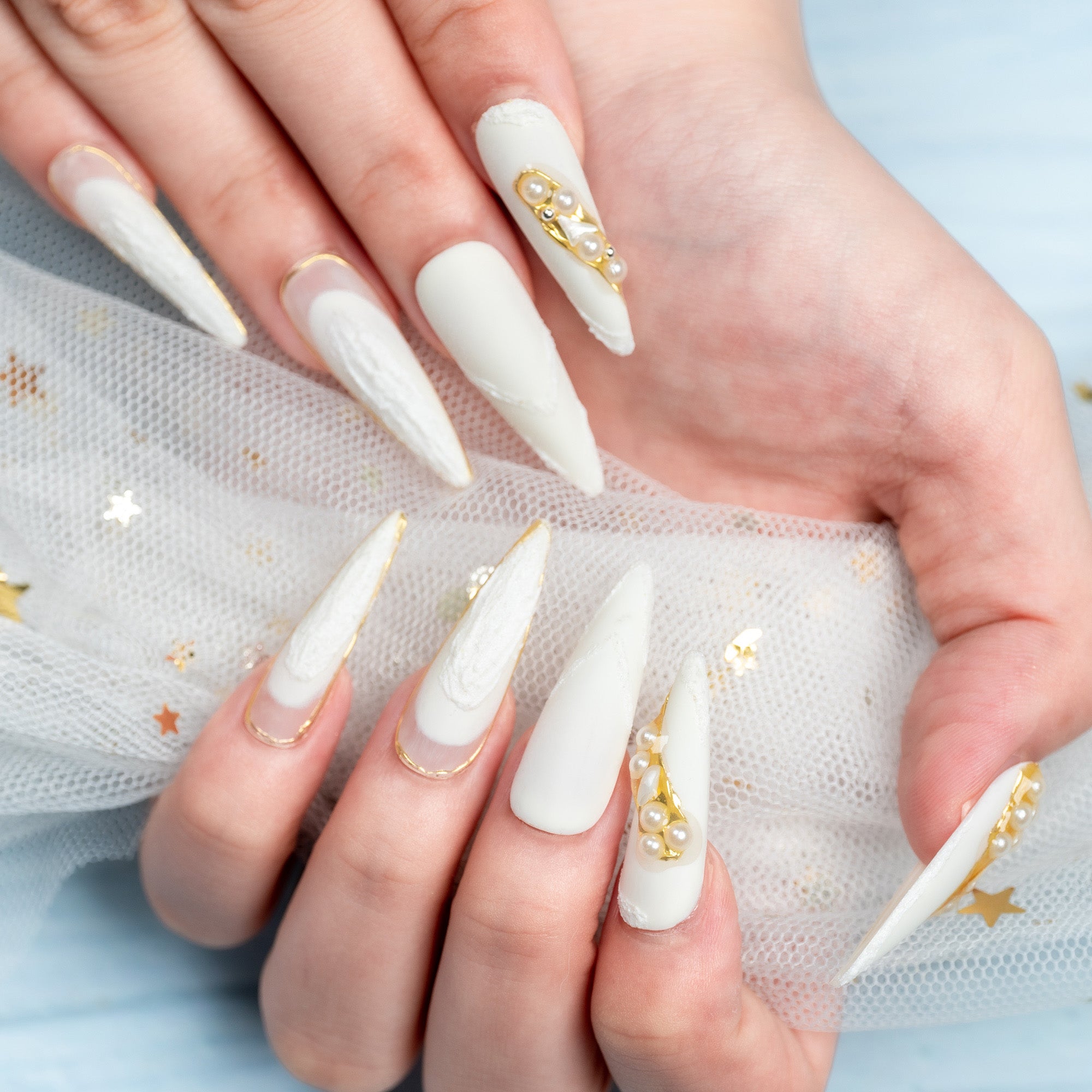 Handmade Long Almond Press-On Nails - Blue White Gold Magnet Flower Minimalist 10 Pcs #215