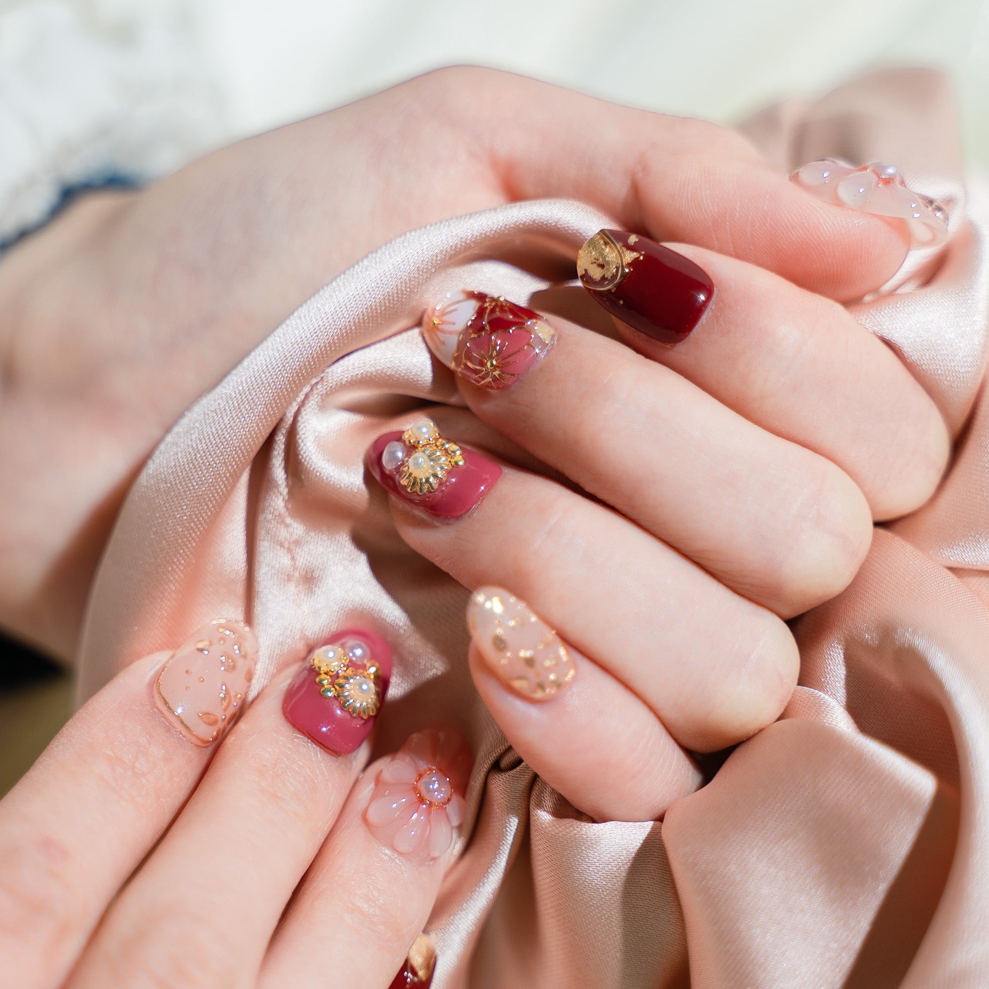 Handmade Short Round Press-On Nails - Red Pink Gold 3D Flower Japanese 10 Pcs #210