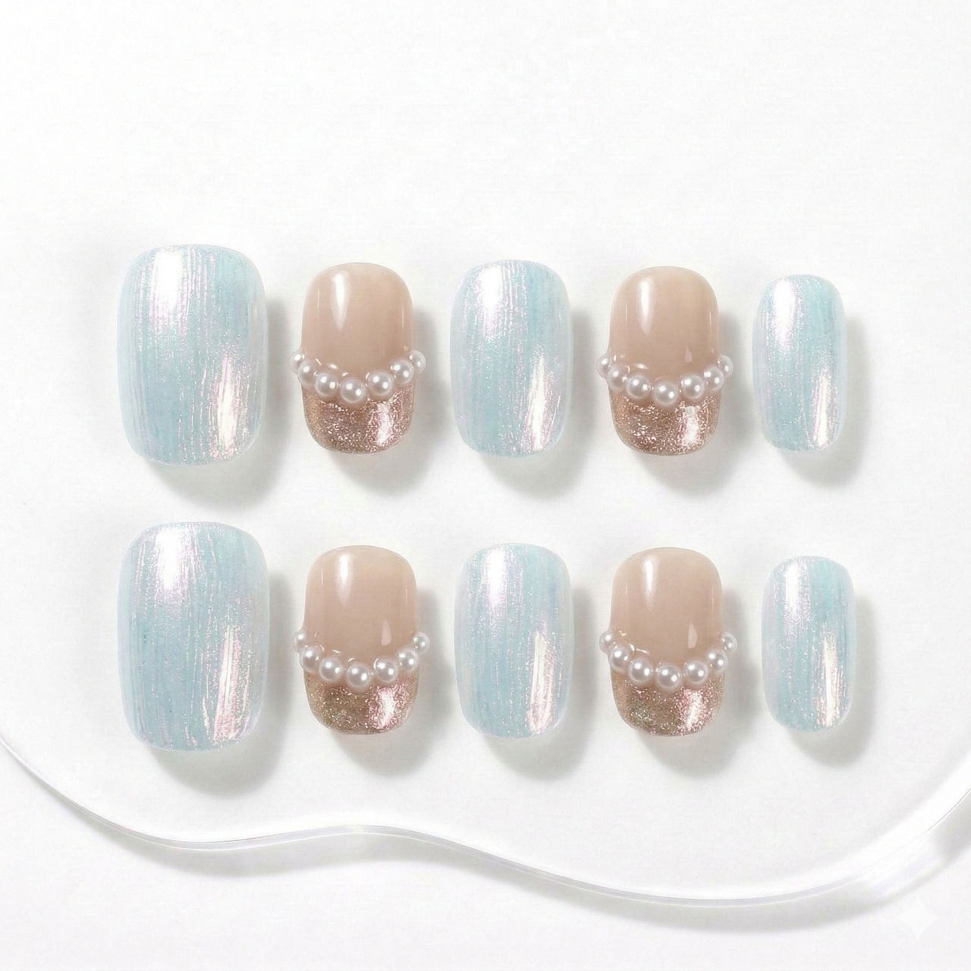 Handmade Press On Nails Short Square Blue Nude Rose Gold Pearl Shimmer Short 10 Pieces #305