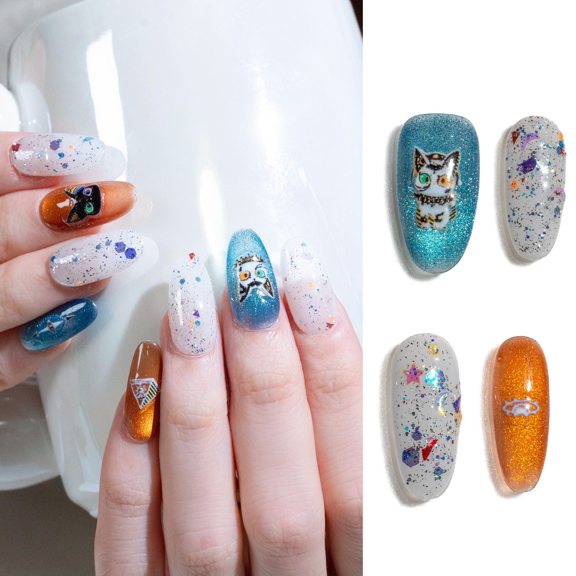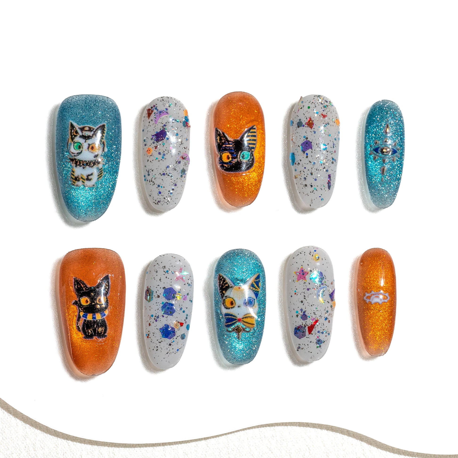 Handmade Medium Almond Press-On Nails - Orange Cartoon Kitten Magnet 10 Pcs #284