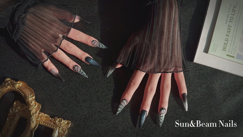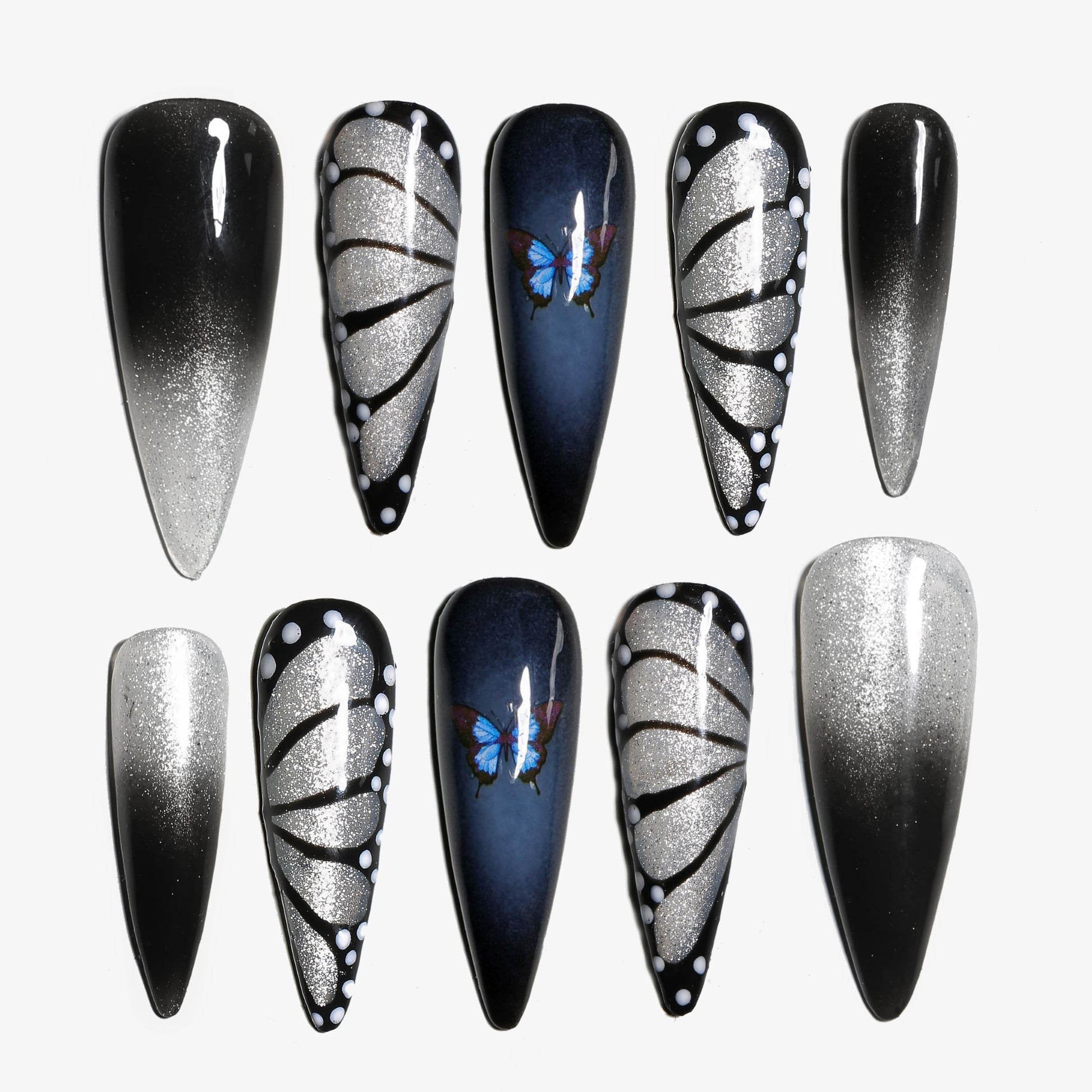Ongles press-on faits main Long Stiletto Amande – Noir Bleu Blanc Peint à la main Papillon Y2K 10 pièces #160
