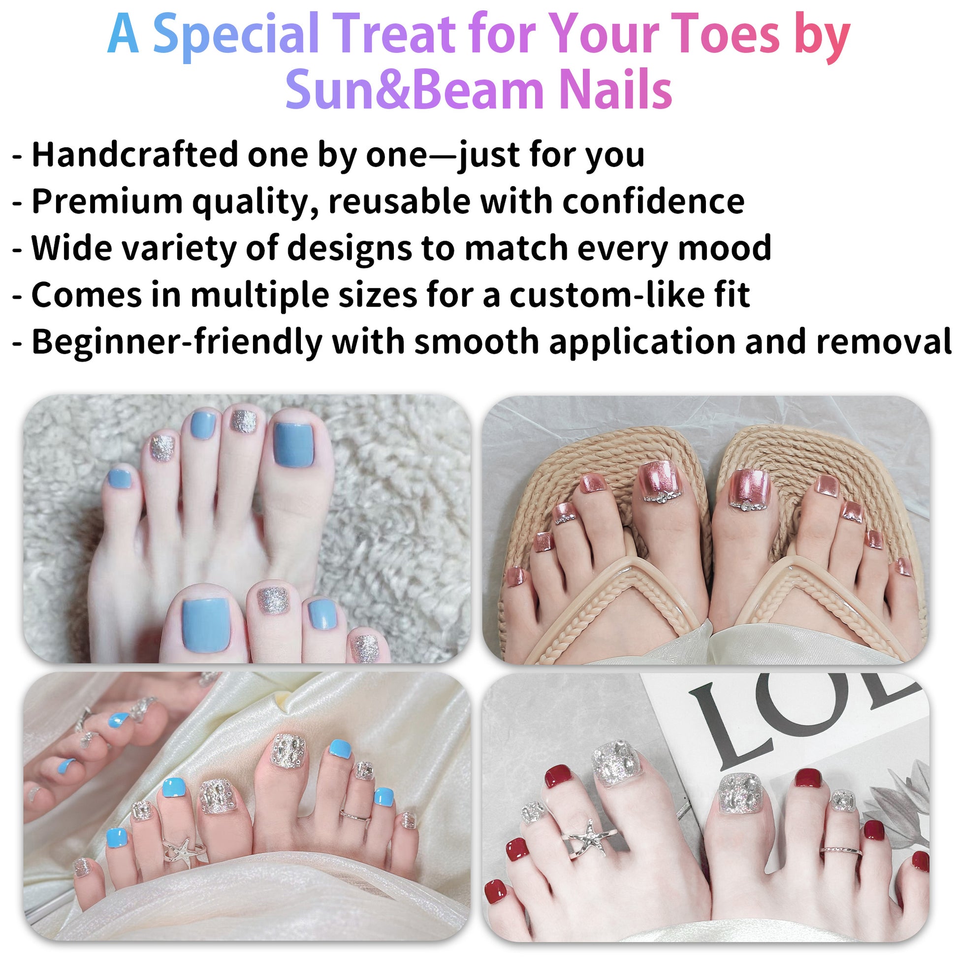 ハンドメイド ショート 短め フット用 ネイルチップ– ブルー ストーン キラキラ 手描き 10枚セット #227