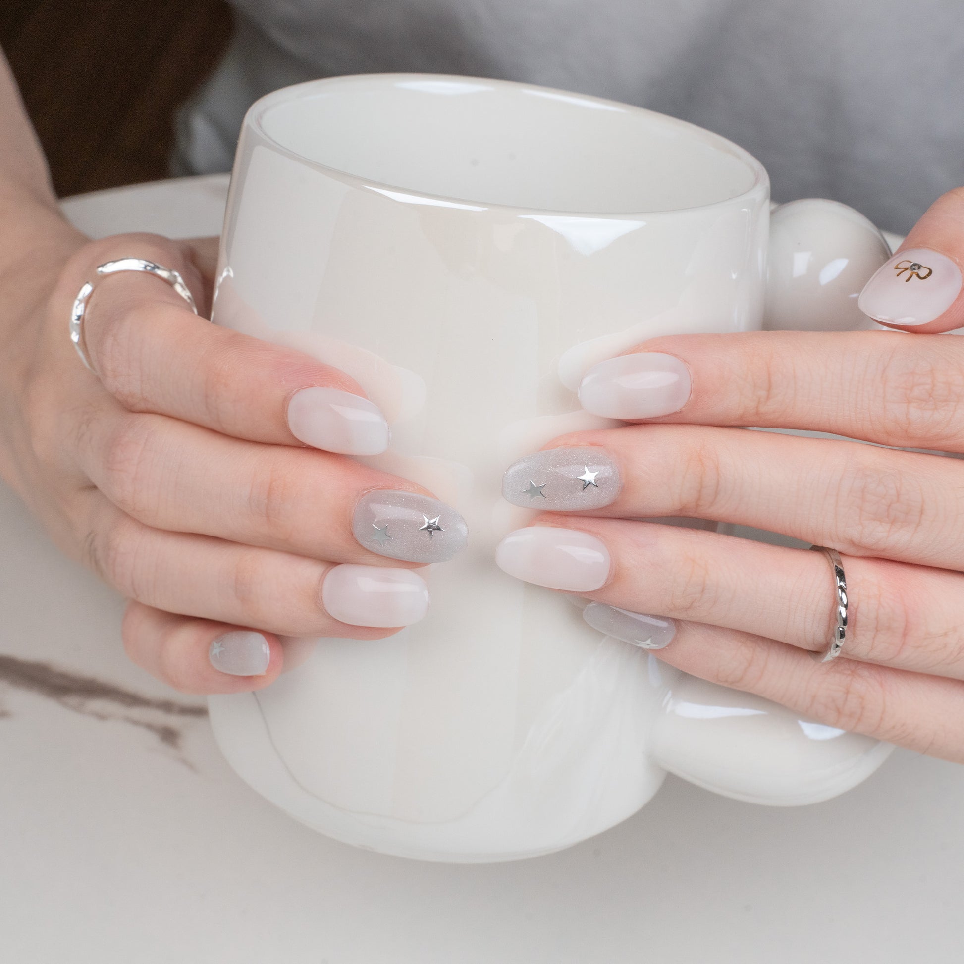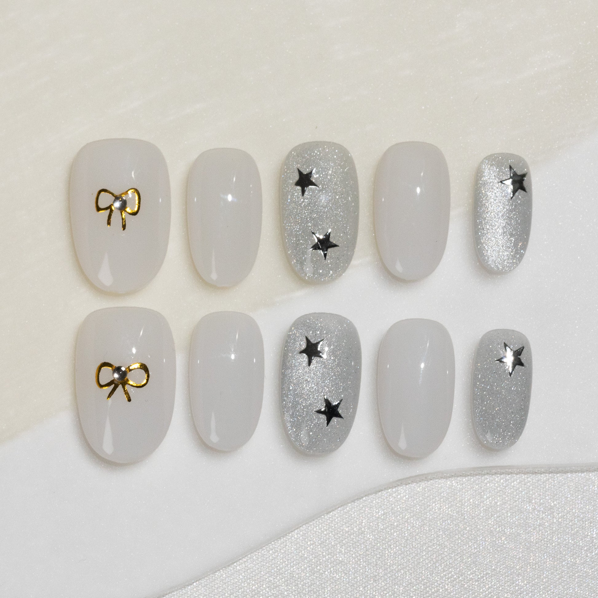ハンドメイド ミディアム オーバル ネイルチップ– ホワイト マグネット スウィート シンプル 10枚セット #251