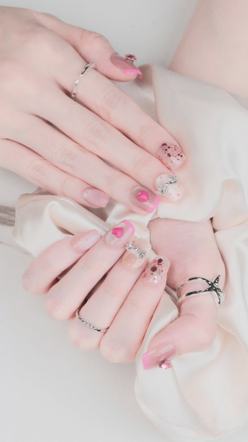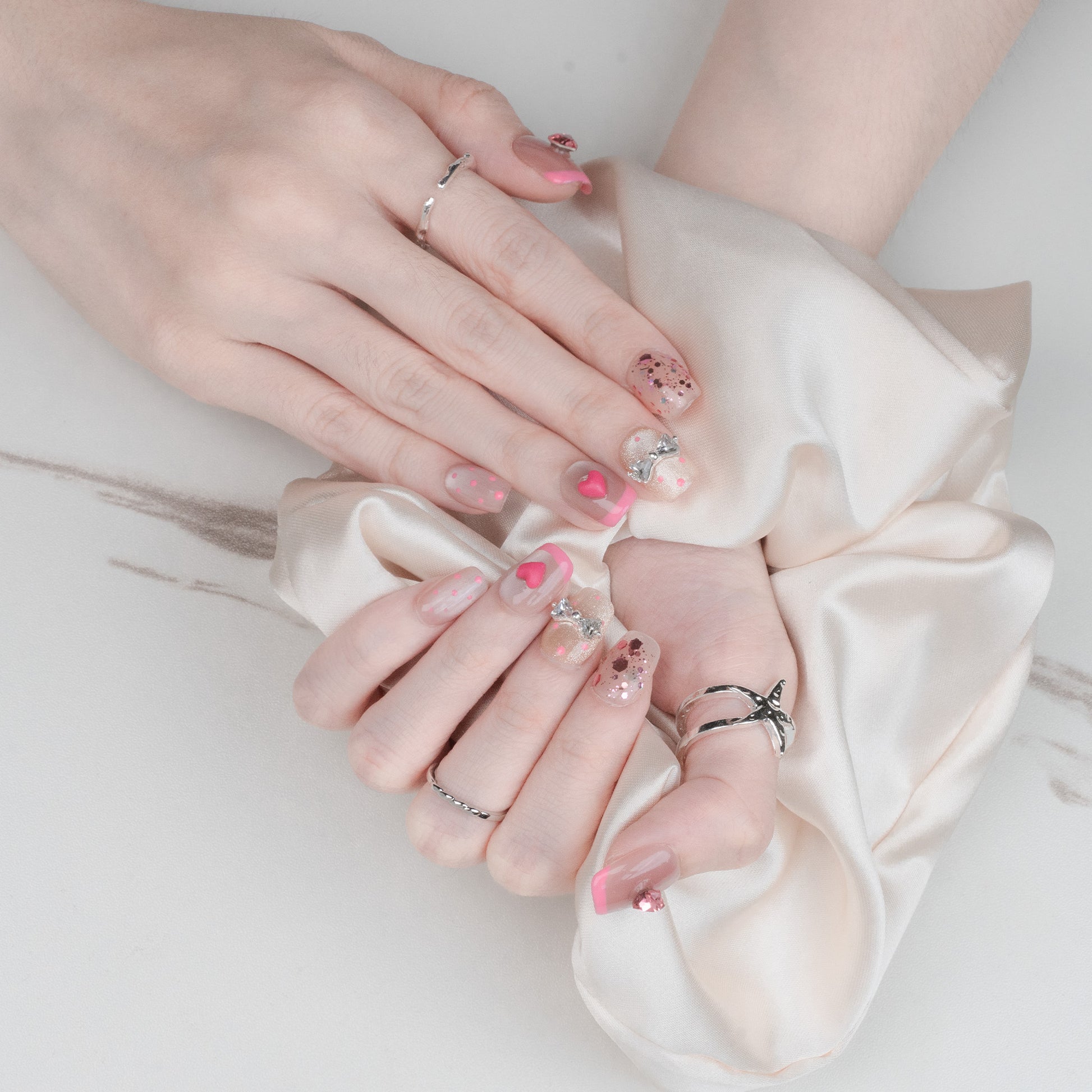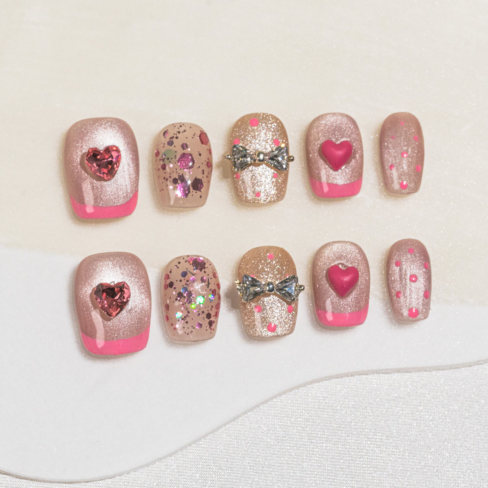 ハンドメイド ショート 短め コフィン バレリーナ ネイルチップ– ピンク フレンチ スウィート ハート 10枚セット #252