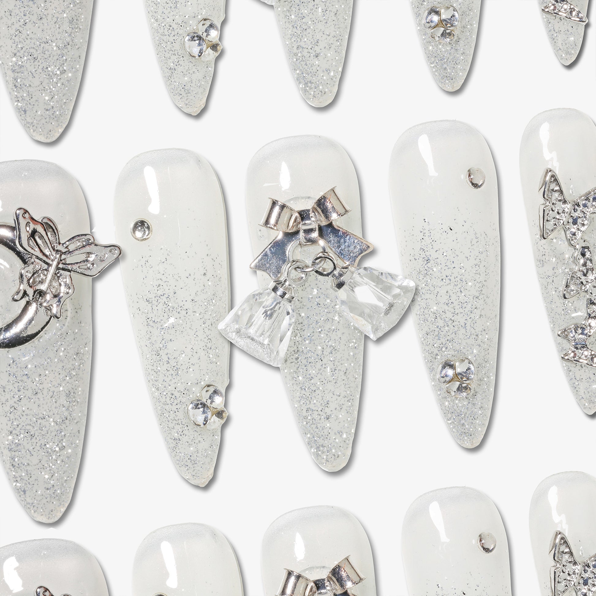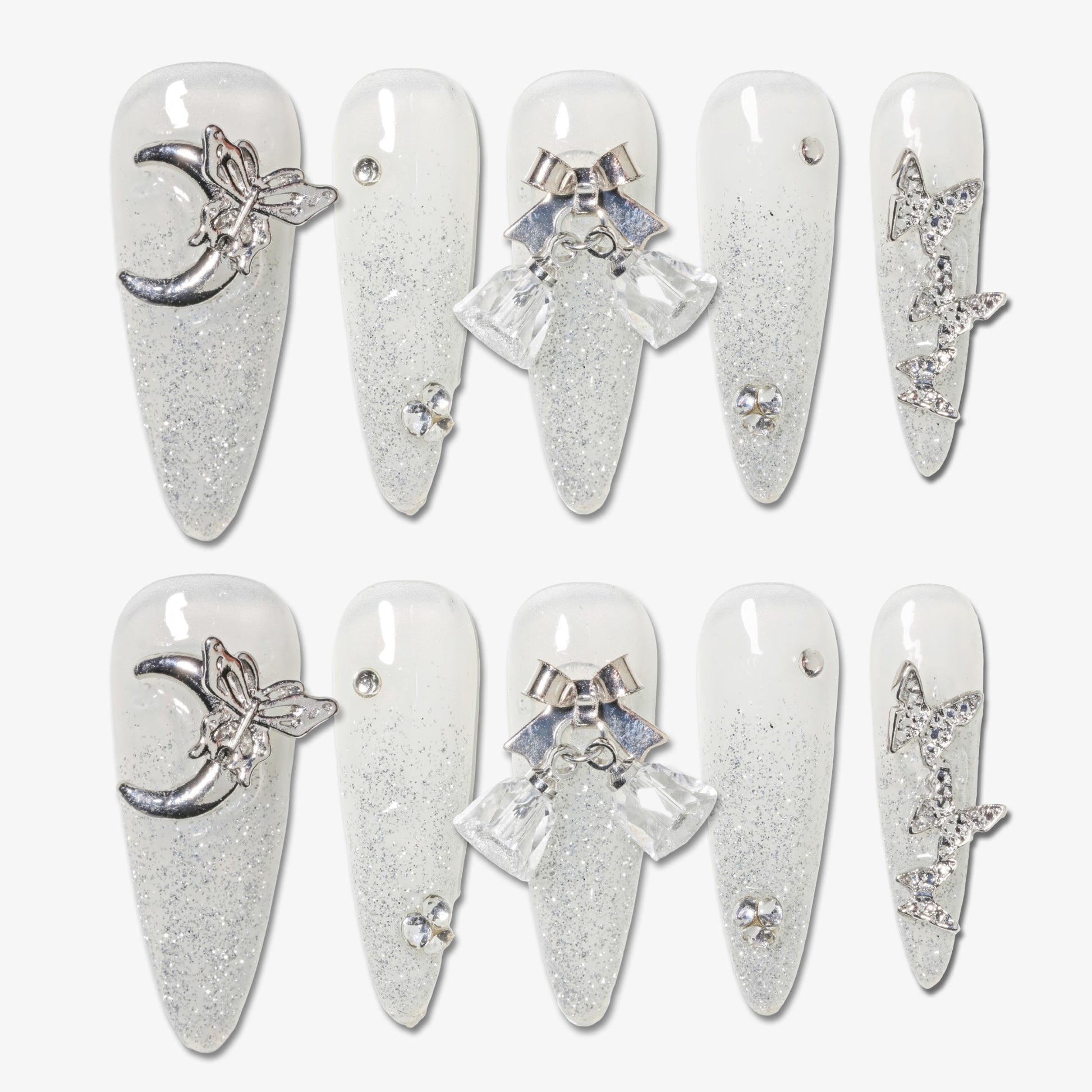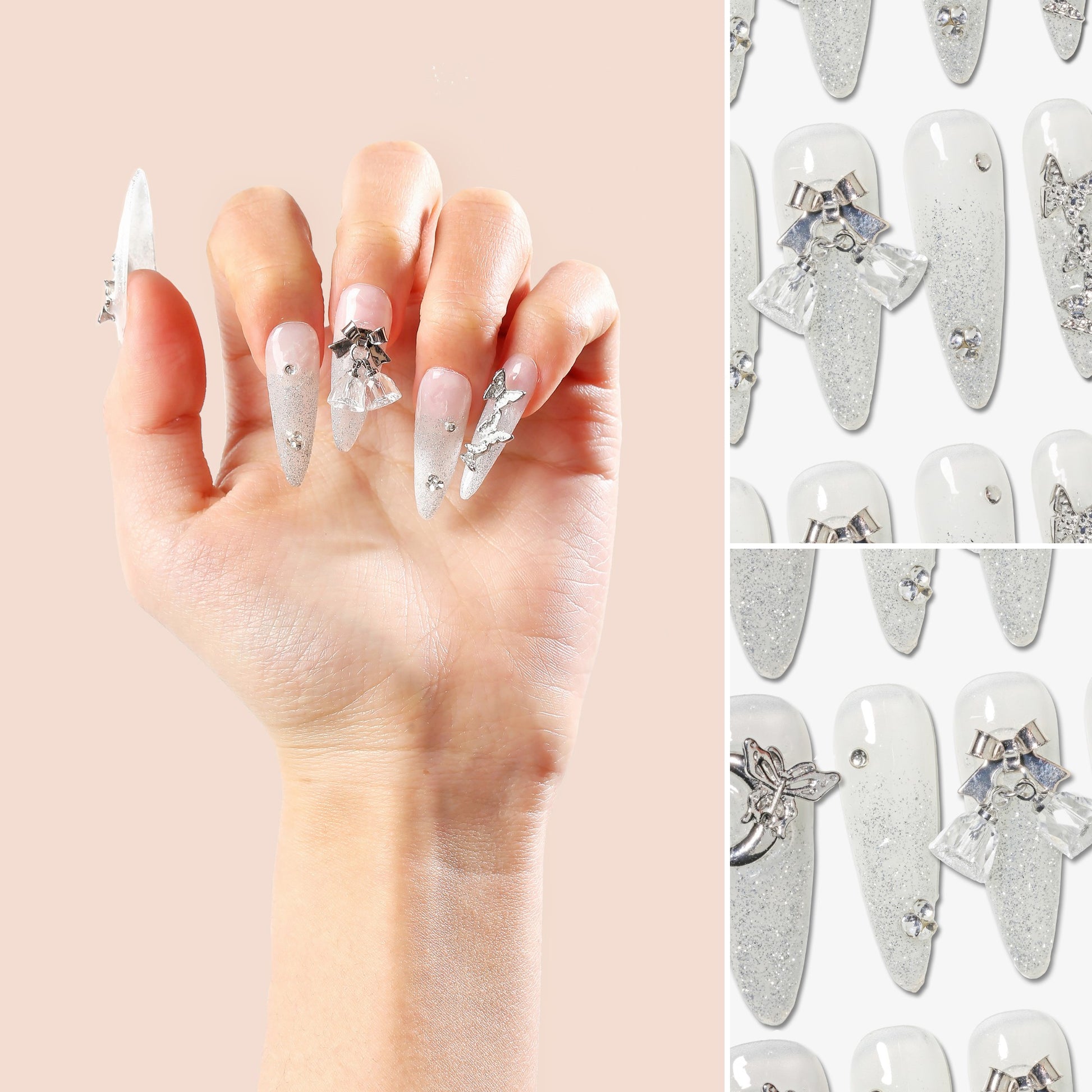 ハンドメイド ロング スティレット アーモンド ネイルチップ– ホワイト シルバー 銀 3D グラデーション スウィート 10枚セット #156