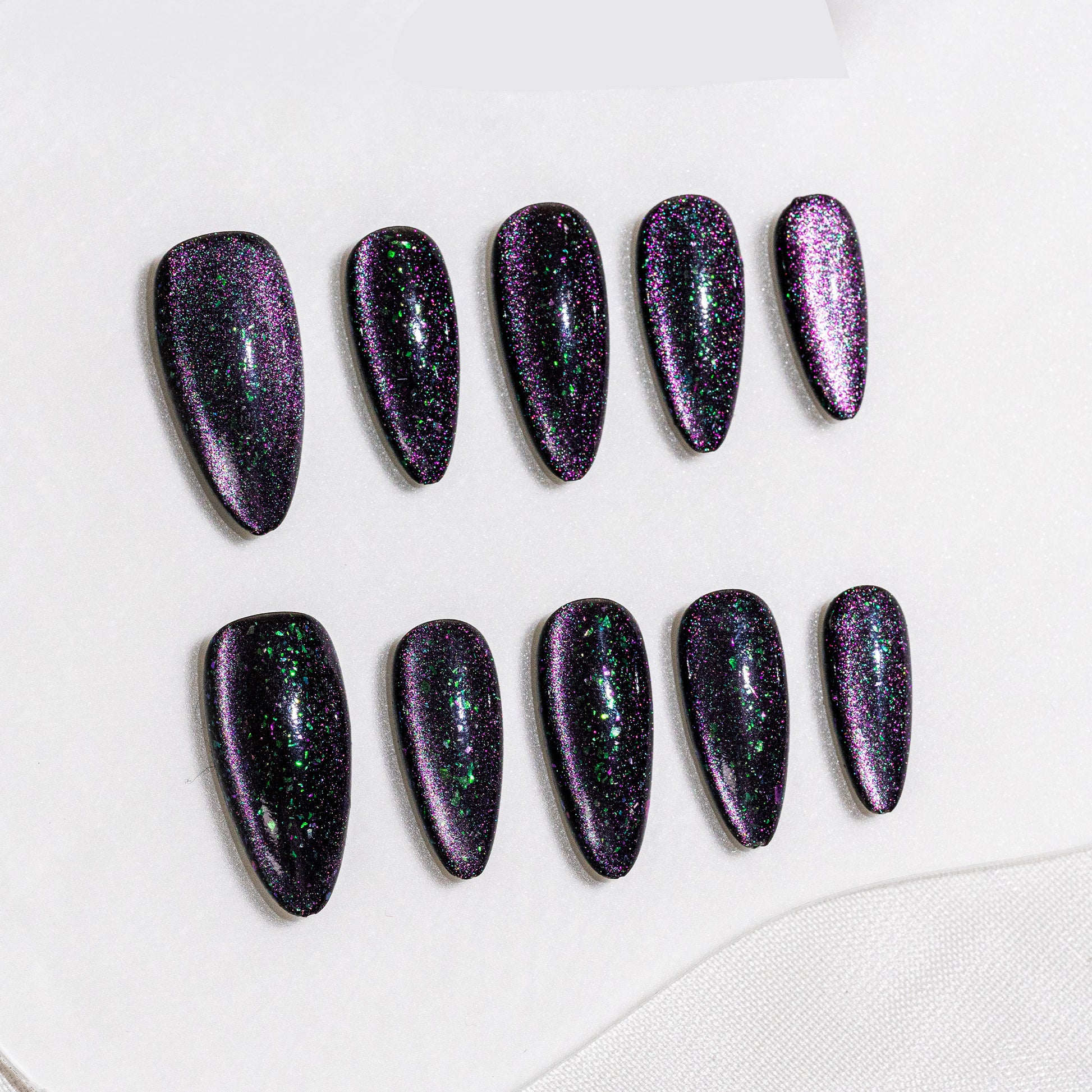 Handmade Medium Almond Press-On Nails - Black Magnet Solid Color Minimalist 10 Pcs #254