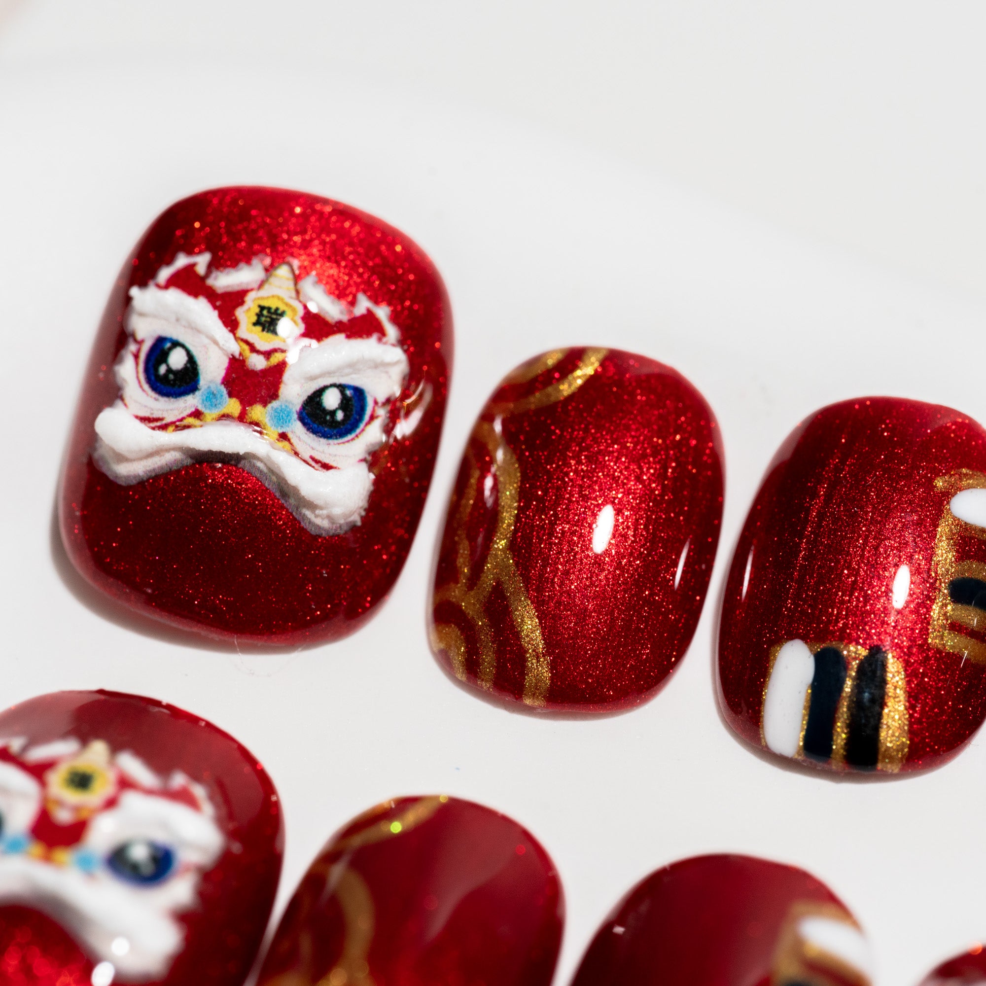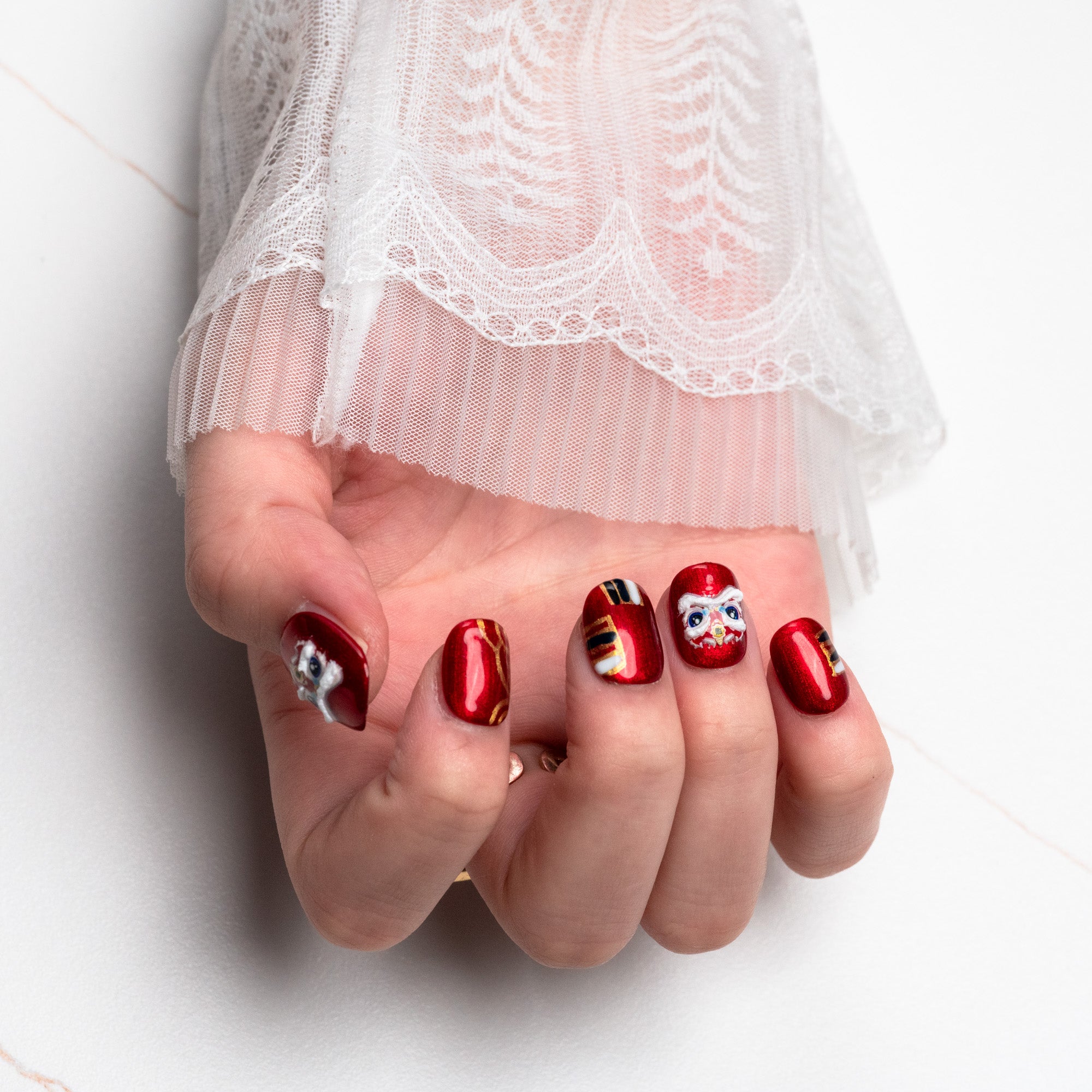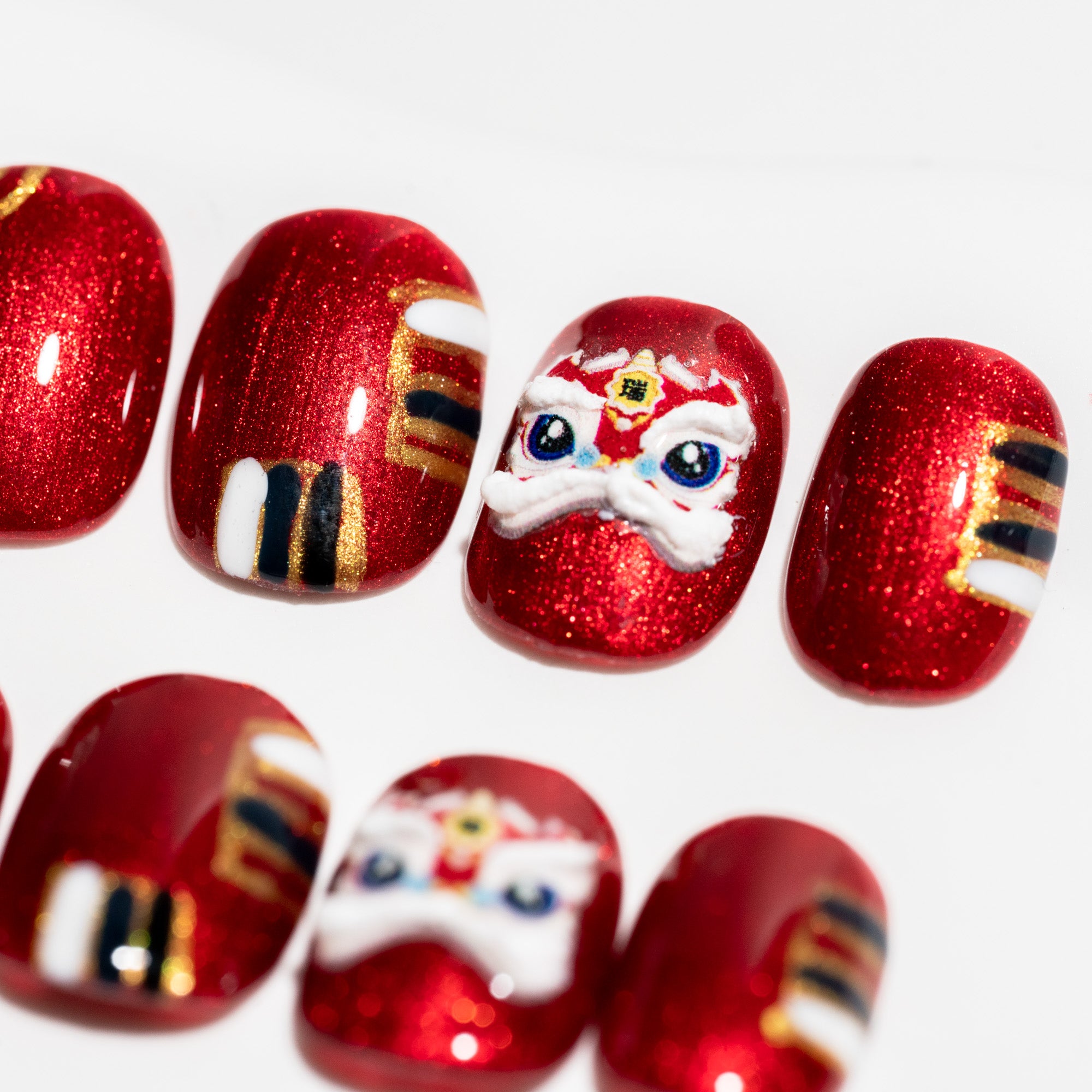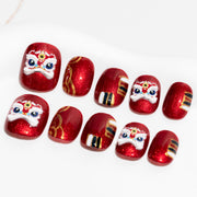 Handmade Short Squoval Round Press-On Nails - Red New Year Hand-Painted glossy 10 Pcs #040