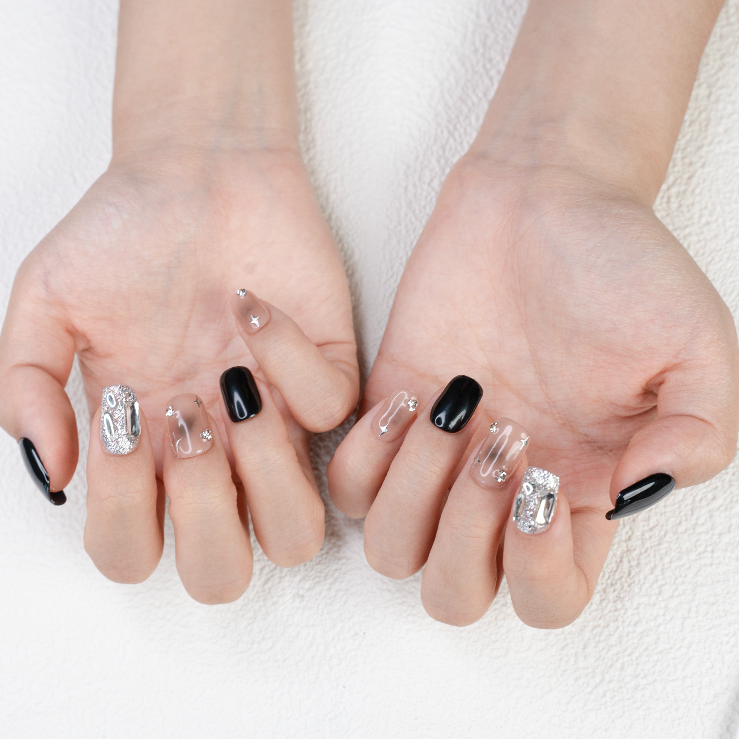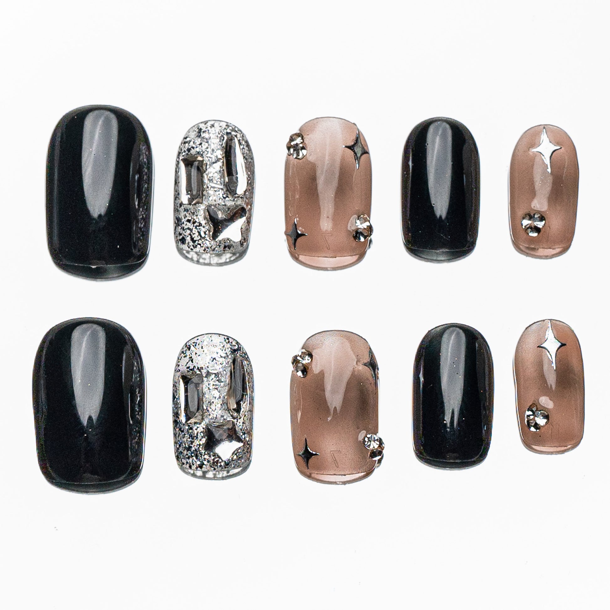 Handmade Short Squoval Round Press-On Nails - Black Silver Pink Nude Beige Rhinestone Trendy glossy 10 Pcs #184