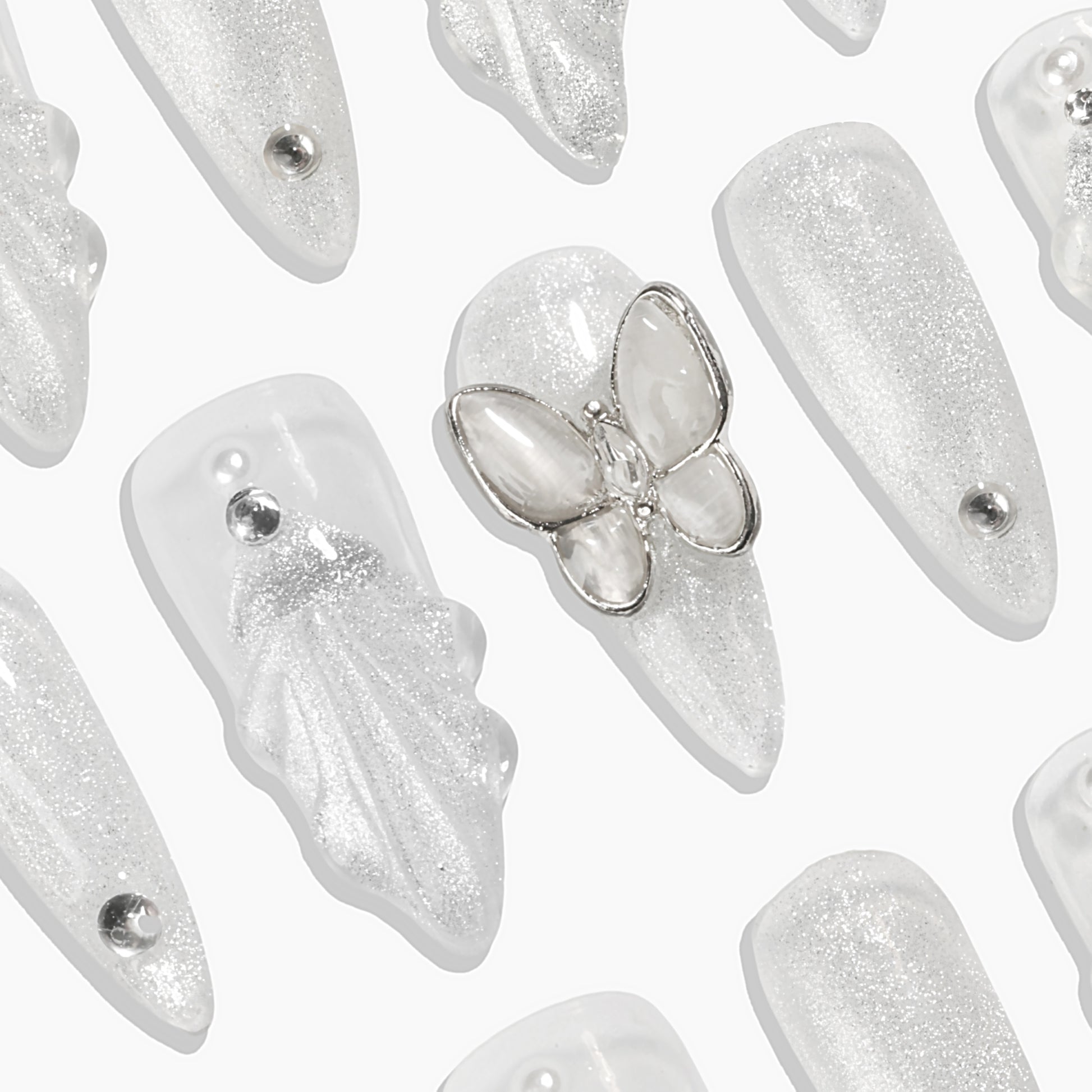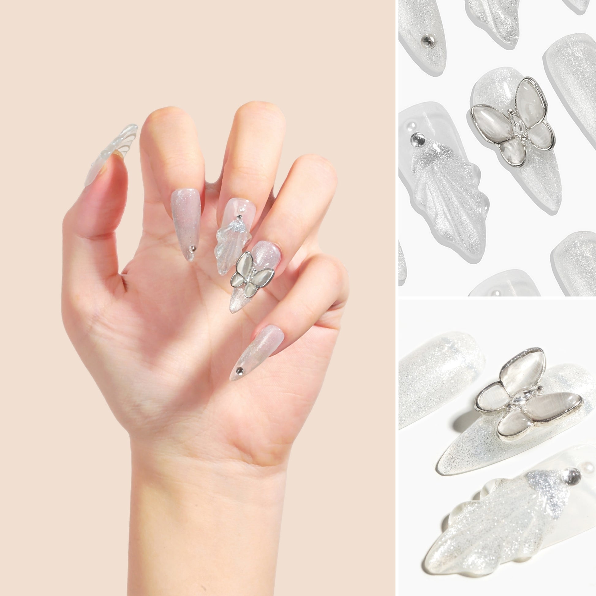 Handmade Long Stiletto Amlond Press-On Nails - White Silver Butterfly Rhinestone Glitter 10 Pcs #020