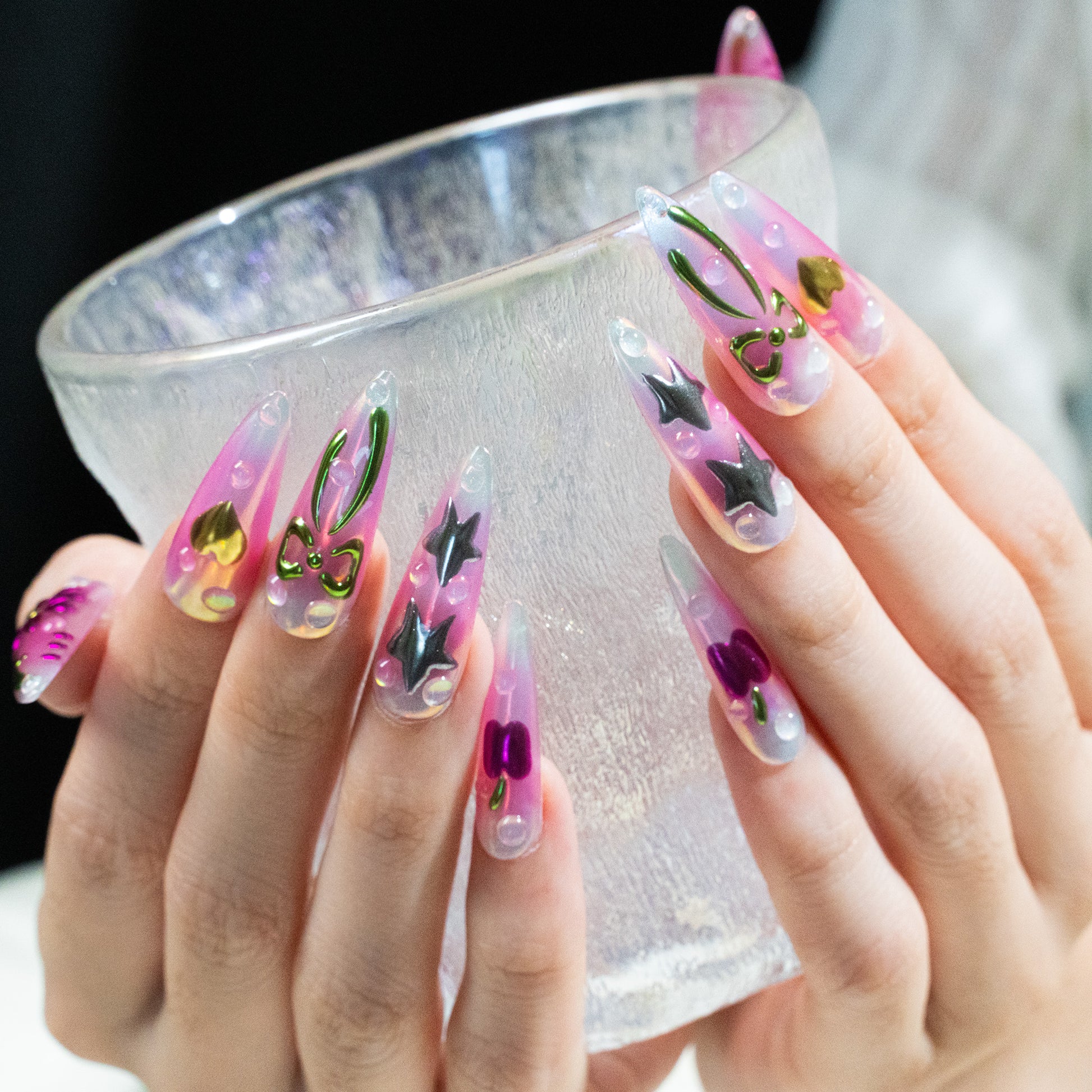 Handmade Long Stiletto Amlond Press-On Nails - Pink 3D Flower Hand-Painted 10 Pcs #277
