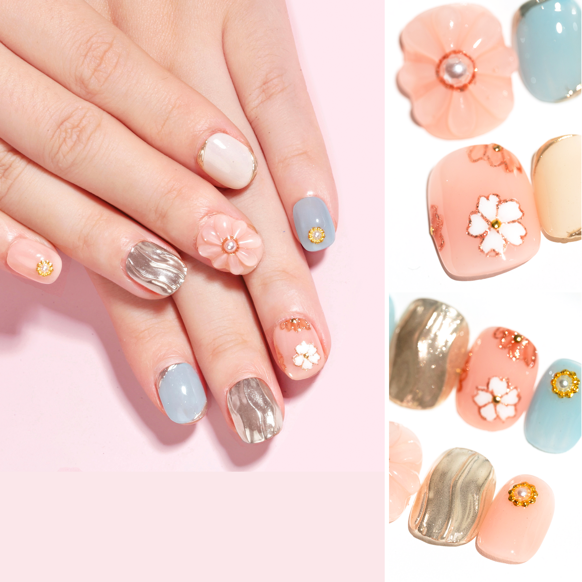 Handmade Short Squoval Round Press-On Nails - Pink Blue Gold Flower 3D Sweet 10 Pcs #100