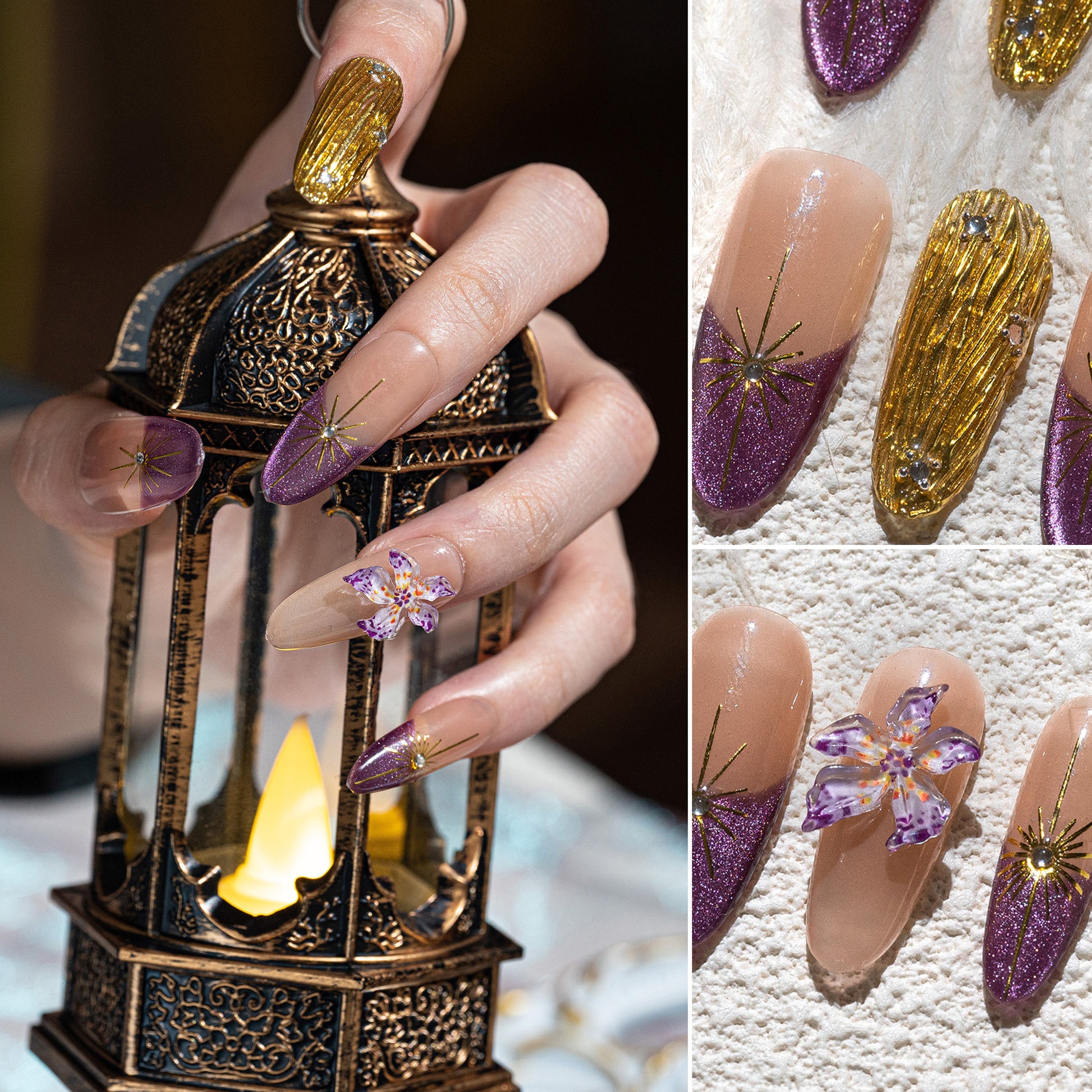 Handmade Long Almond Press-On Nails - Purple Yellow Rhinestone Hand-Painted Gradation 10 Pcs #222
