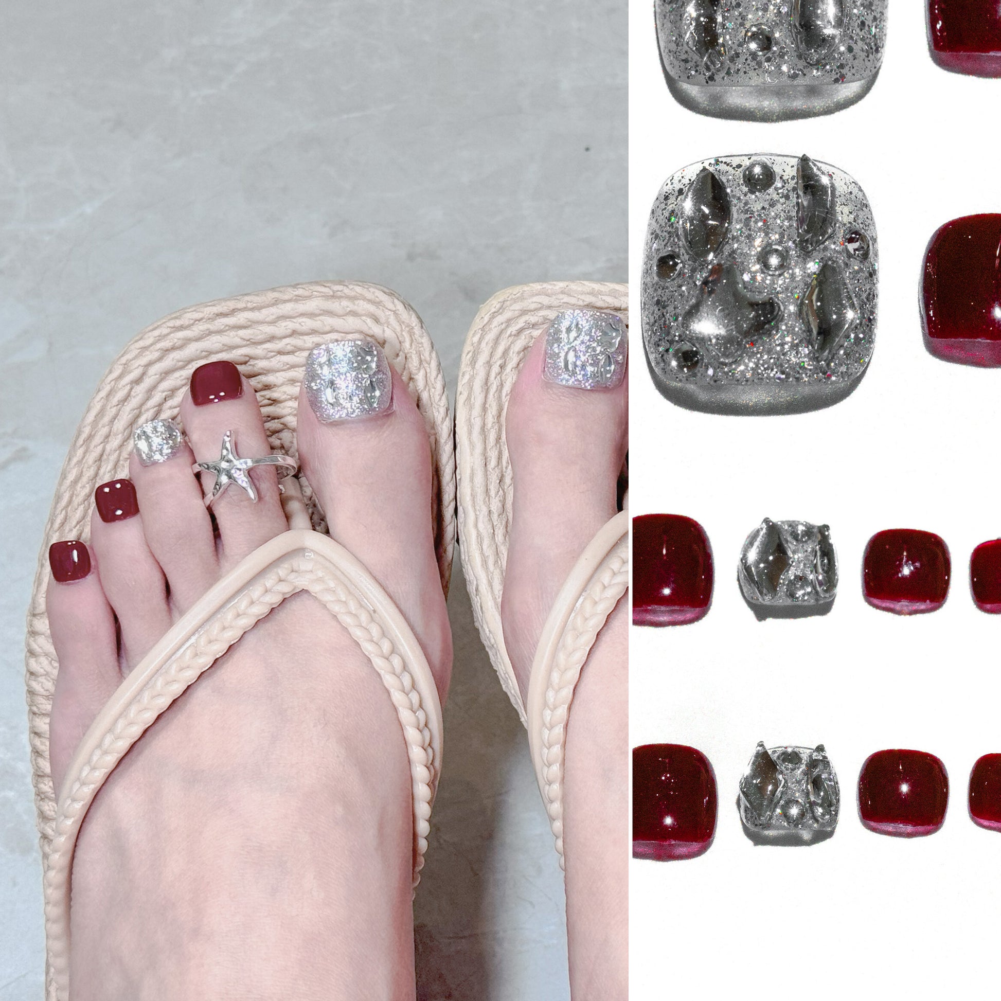 Handmade Short for Toes Press-On Nails - Red Silver Rhinestone Glitter Hand-Painted 10 Pcs #229